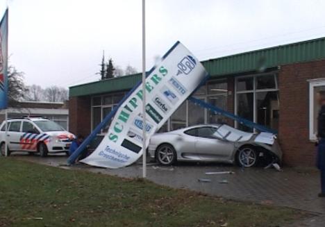 Ferraris aren’t the sort of cars that one should drive light heartedly – especially if the one you’re driving isn’t actually yours. Yes that’s right, Marcel Wiggers, owner of sports car dealership “Wiggers Mastercars” in Enschede, Holland, was delivering the 360 Modena to its new owner before he parked it (literally) in a shop. According to Wiggers, he was going no faster than 50 km/h or 31 mph when he lost control of the 360 Modena due to the slippery road. We believe him, but we can’t wait to hear him say that to the owner of the car… -More images after the jump